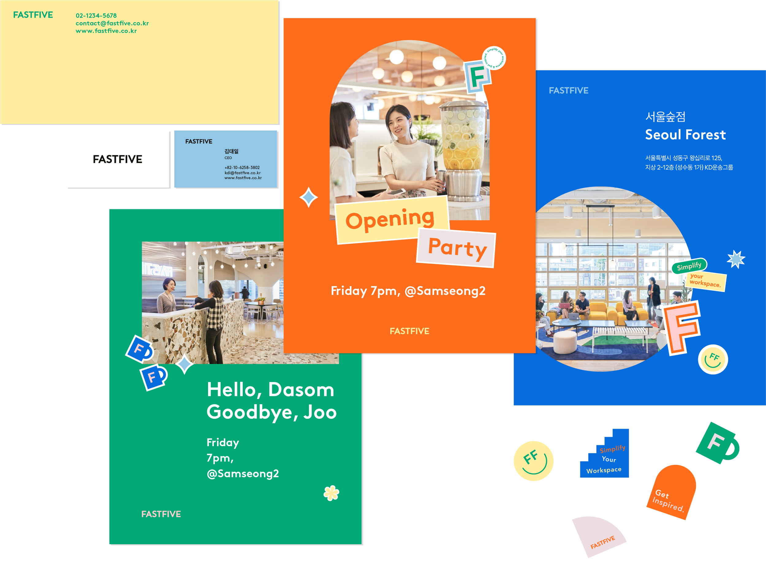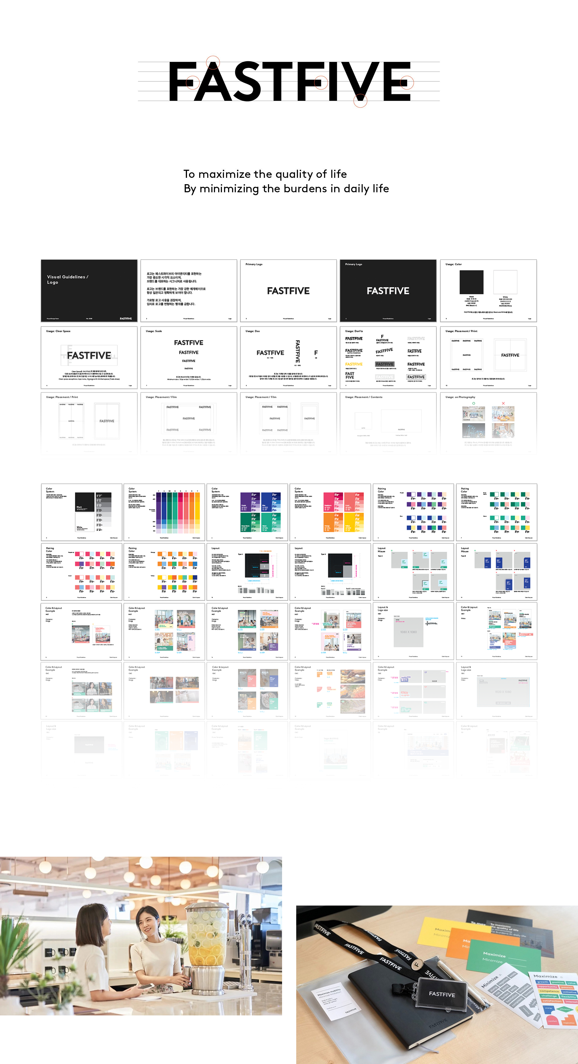 The existing slogan “Simplify your workspace and get inspired” was revised to “Simplify your workspace” more intuitively, and the mission of the business that FASTFIVE will expand in the future is “To maximize the quality of life by minimizing the burdens in daily life” was defined. The vivid and energetic brand colors that contain the values of FASTFIVE are applied to brand materials and spaces to provide a better brand experience to everyone who meets FASTFIVE.