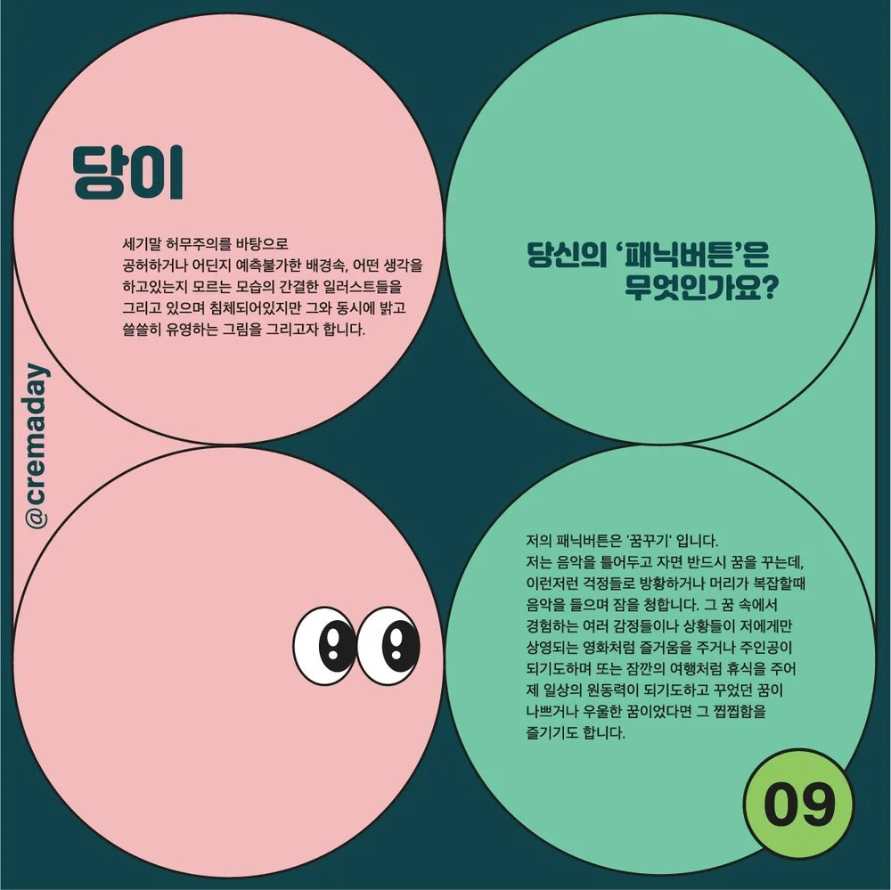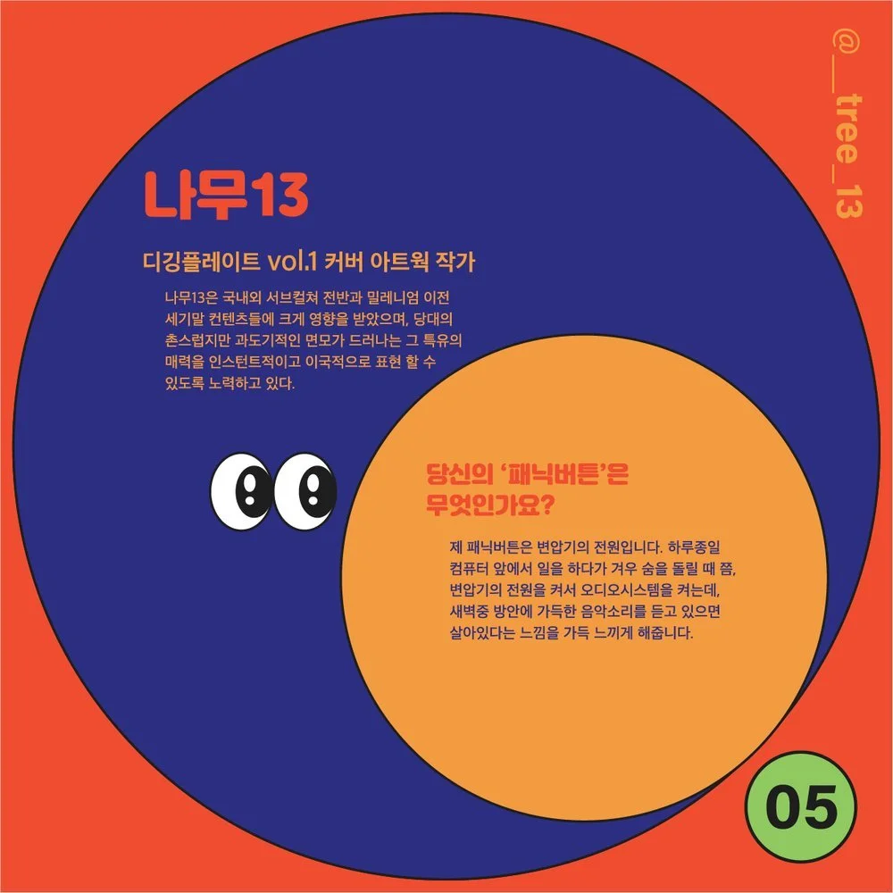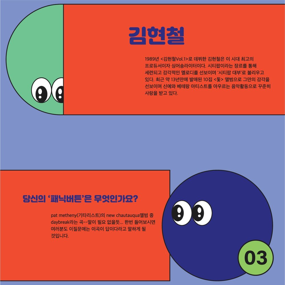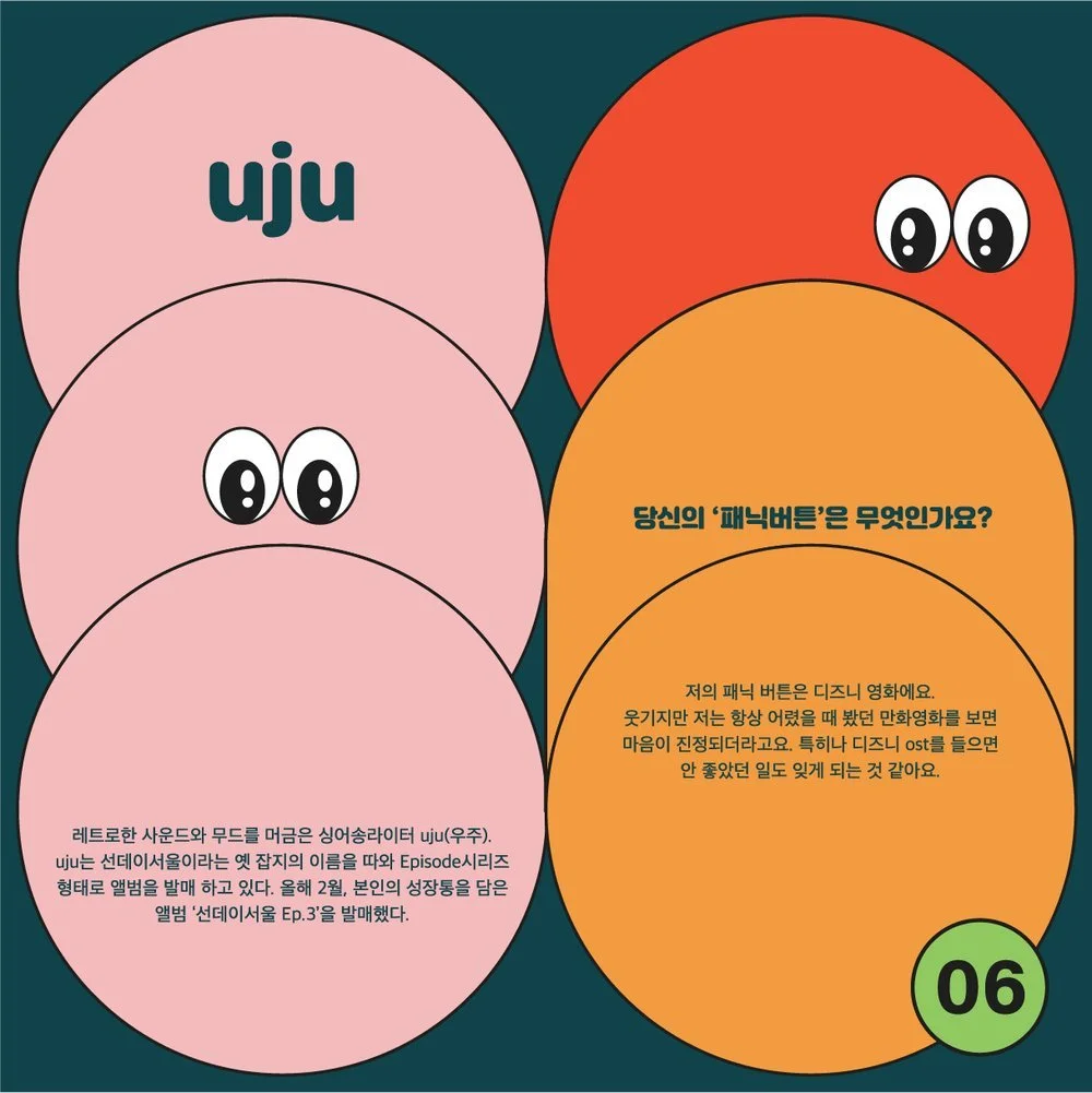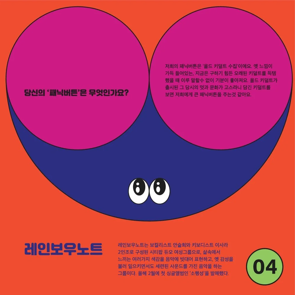 To achieve this, I designed a round character inspired by the common circular shape of LPs and CDs, using the direction of its eyes to naturally guide the reader's gaze. The character's colors were chosen to reflect Don't Panic's vibrant and creative identity, harmonizing with the album covers and artworks on the left-hand pages. By maximizing the advantages of the magazine's distinctive square format and individual page composition, I aimed to provide readers with visual enjoyment through ever-changing designs and layouts that complemented the album covers.