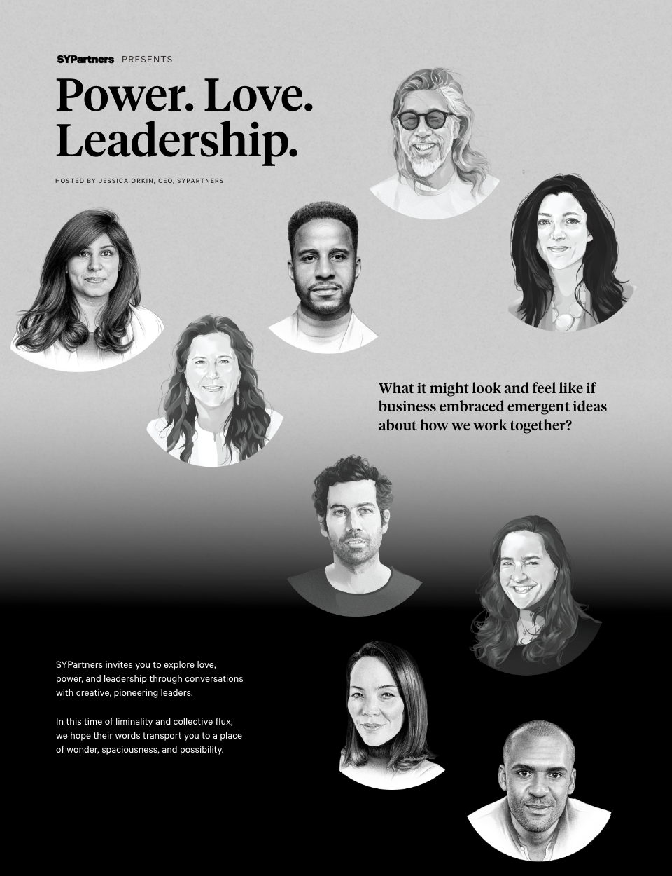 This series features SYPartners' CEO Jessica Orkin in profound conversations with eight creative and visionary leaders, delving into the role of leaders within organizations and the complex themes of love and power. The series is structured into two parts, with each part featuring dialogues between Jessica and four leaders.